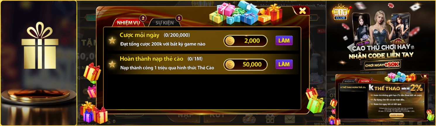 Tại đây, khuyến mãi giới hạn không chỉ là điểm nhấn nhất thời mà còn là chiến lược lâu dài mà hệ thống khuyến mãi của HitClub luôn theo đuổi. Thường xuyên có những sự kiện là cách mà HitClub đem đến bất ngờ đến cho cược thủ. Hiện nay HitClub đang khuấy đảo cộng đồng game thủ với sự kiện cực hot “9999 Code Lộc Phát 50K”.